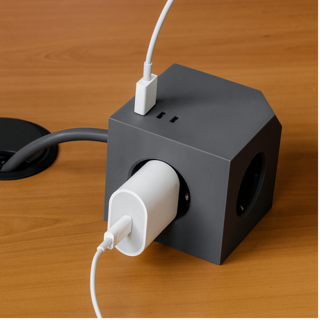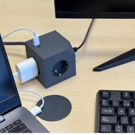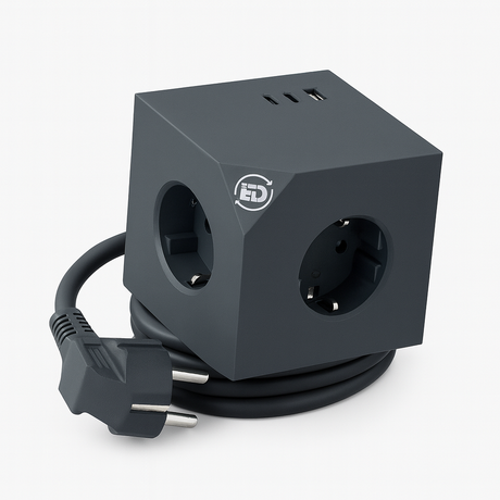 Regleta de enchufe múltiple tipo cubo con anclaje magnético, 3680W 2 puertos USB-C, USB-A, 3 tomas Schuko, cable de 1,5mt, gris.