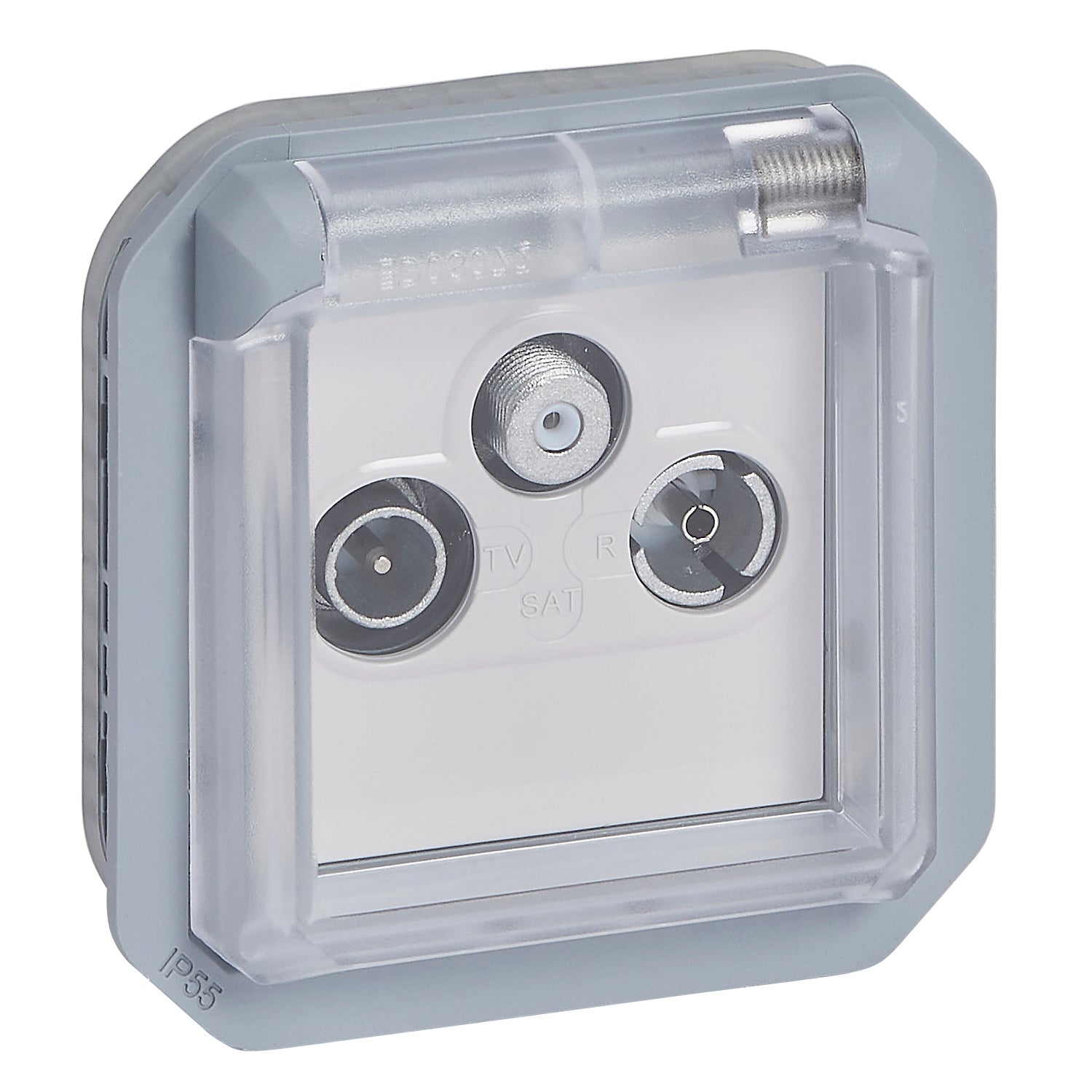 Base TV-R-SAT Plexo modular en color gris, diseñada para la instalación de tomas de televisión y satélite en un solo módulo.