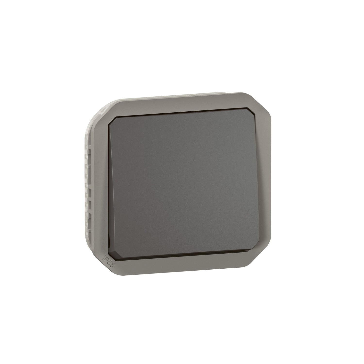 Conmutador Plexo modular IP55 -IK08-10AX-Antracita, ideal para exteriores, ofrece alta resistencia y protección contra el agua y el polvo, con un diseño elegante en color antracita.