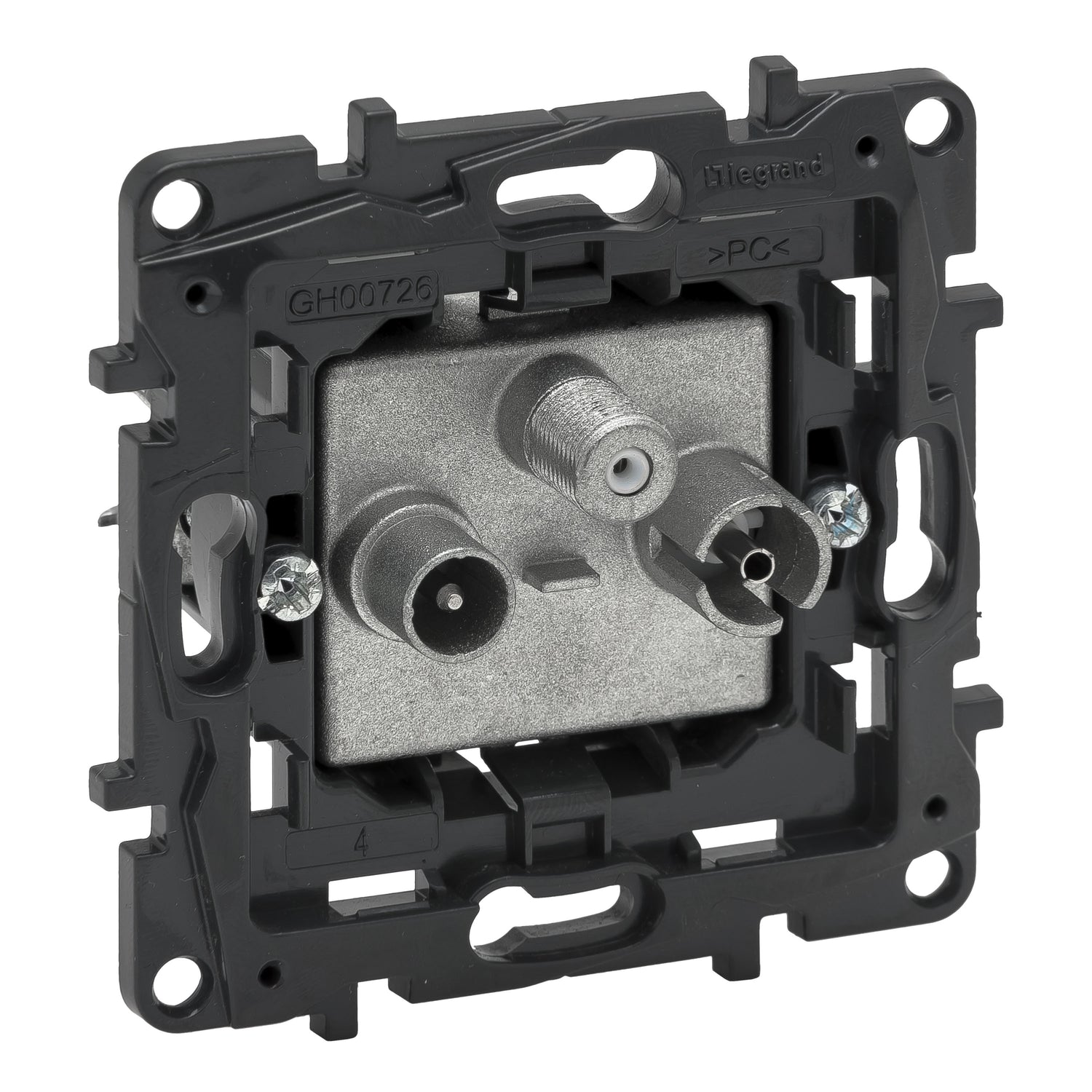 Base de televisión con soporte para señal satelital, diseñada para una instalación sencilla y eficiente en espacios reducidos.