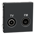 Toma TV-FM de diseño compacto, ideal para instalaciones de audio y video, que permite la conexión de dispositivos de televisión y radio en un solo módulo.