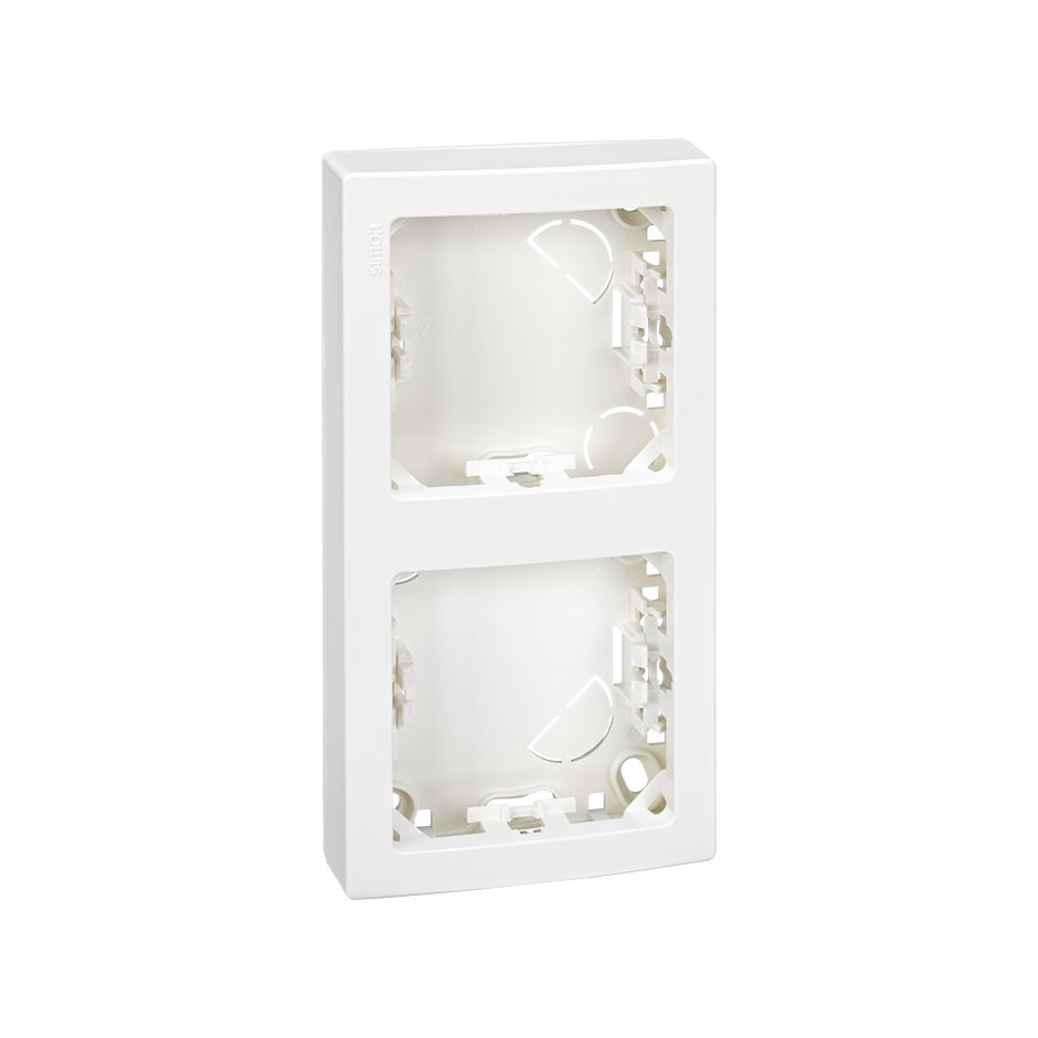 Marco con base para dos elementos, en acabado de color blanco. Este marco, de instalación vertical, pertenece a la serie Simon 73 Loft. Para aportar armonía a la estancia en la que se coloca es recomendable recurrir a las teclas y tapas en el mismo acabado blanco del marco.