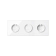 Kit front para 3 elementos de color blanco y acabado brillante que consta de 3 bases de enchufe tipo schuko. El producto destaca por ofrecer un sistema de embornamiento por corte (1 clic) y un tipo de accionamiento mediante inserción.
