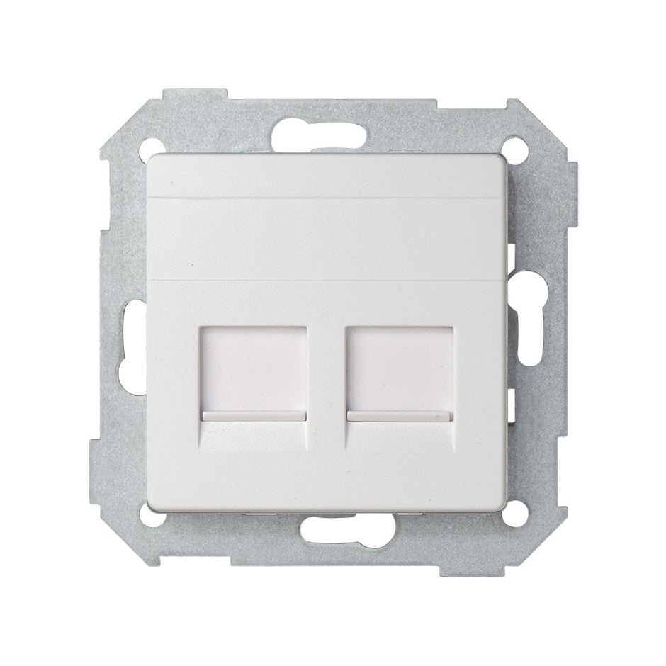 Placa de voz y datos plana con guardapolvo para 2 conectores RJ45 en blanco mate, ideal para instalaciones elegantes y funcionales en entornos residenciales y comerciales.